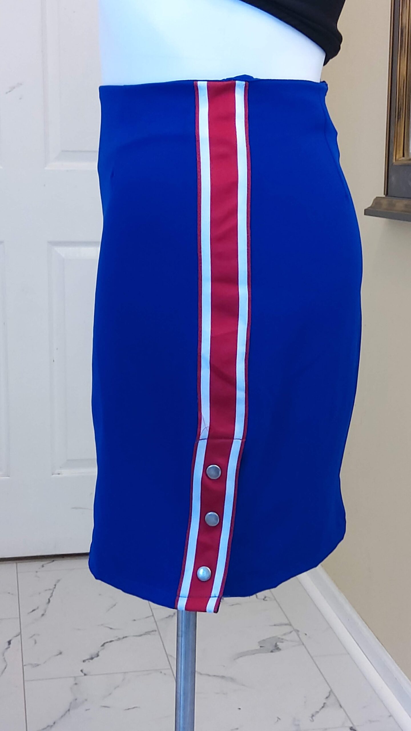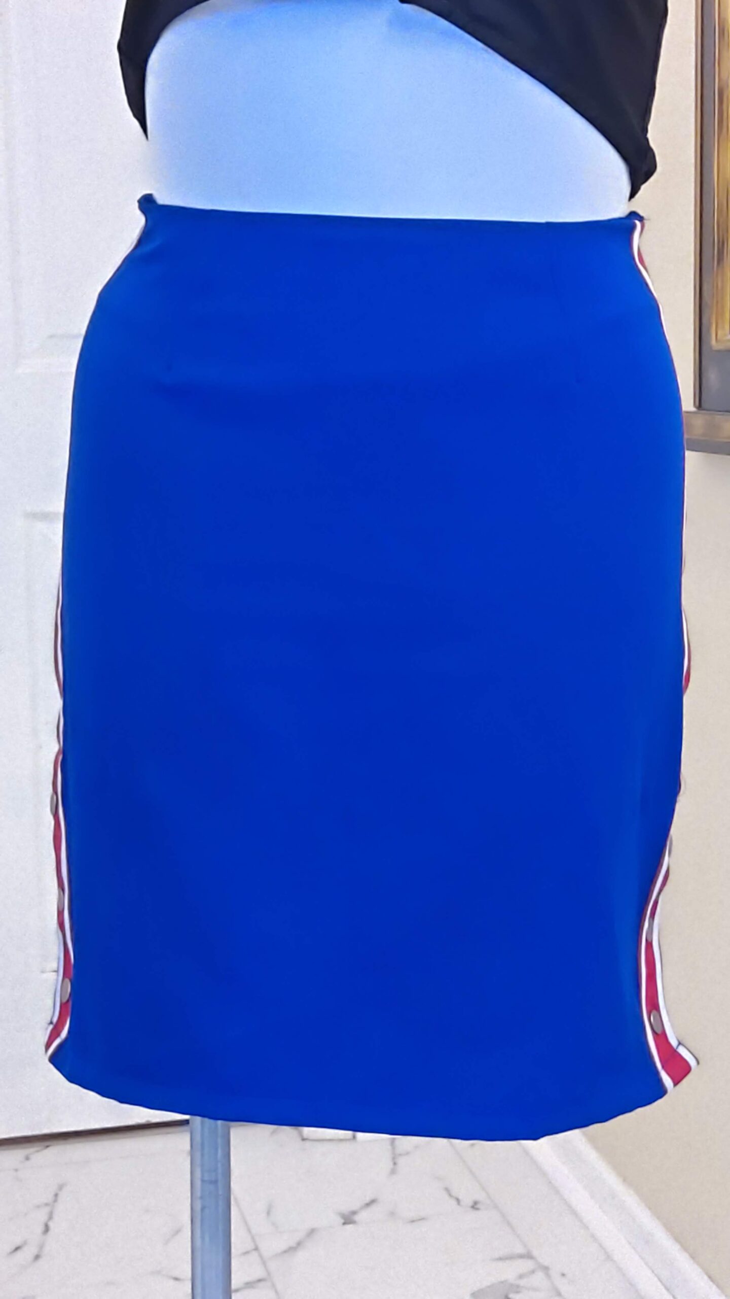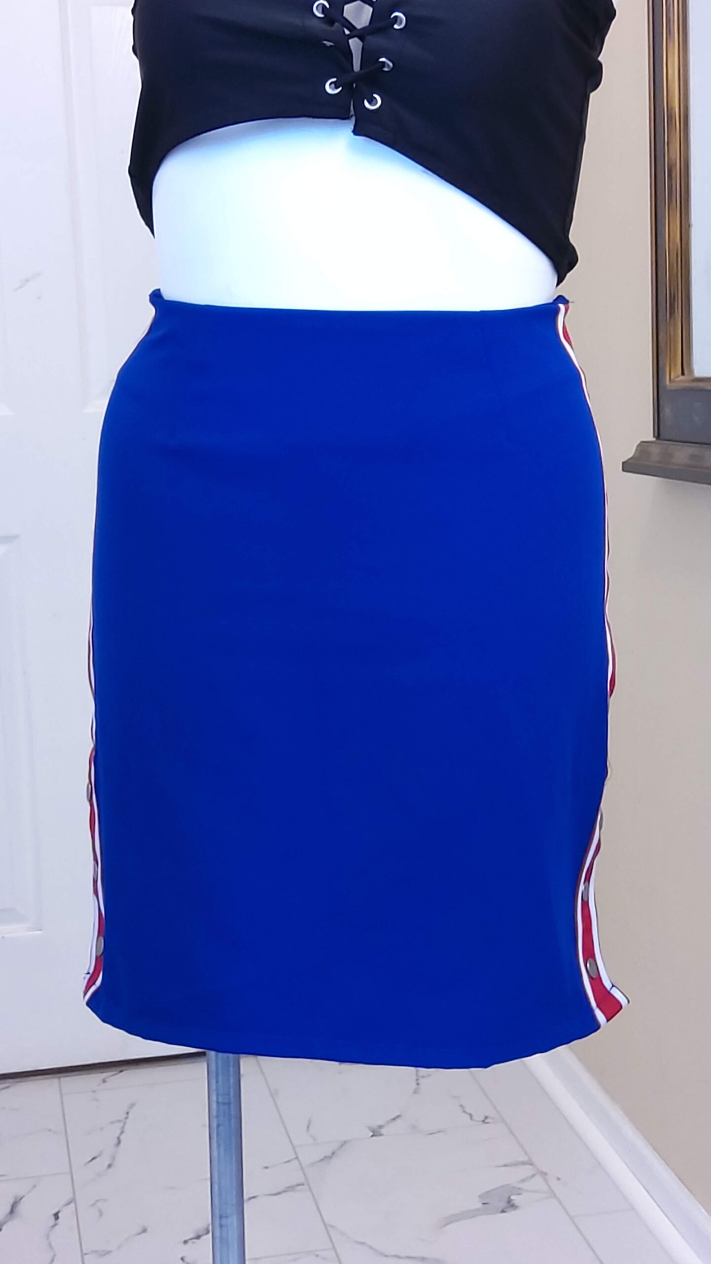 Navy Snap Mini Skirt trim in red & white stripes on the side